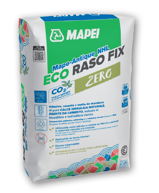 Mape-Antique NHL ECO Raso Fix is an adhesive, skimming and masonry mortar, based on pure natural hydraulic lime, cementfree, for blocks and panels made of wood fibre, hemp lime, calciumsilicate or other natural and/or mineral materials, suitable for green building and historic buildings.