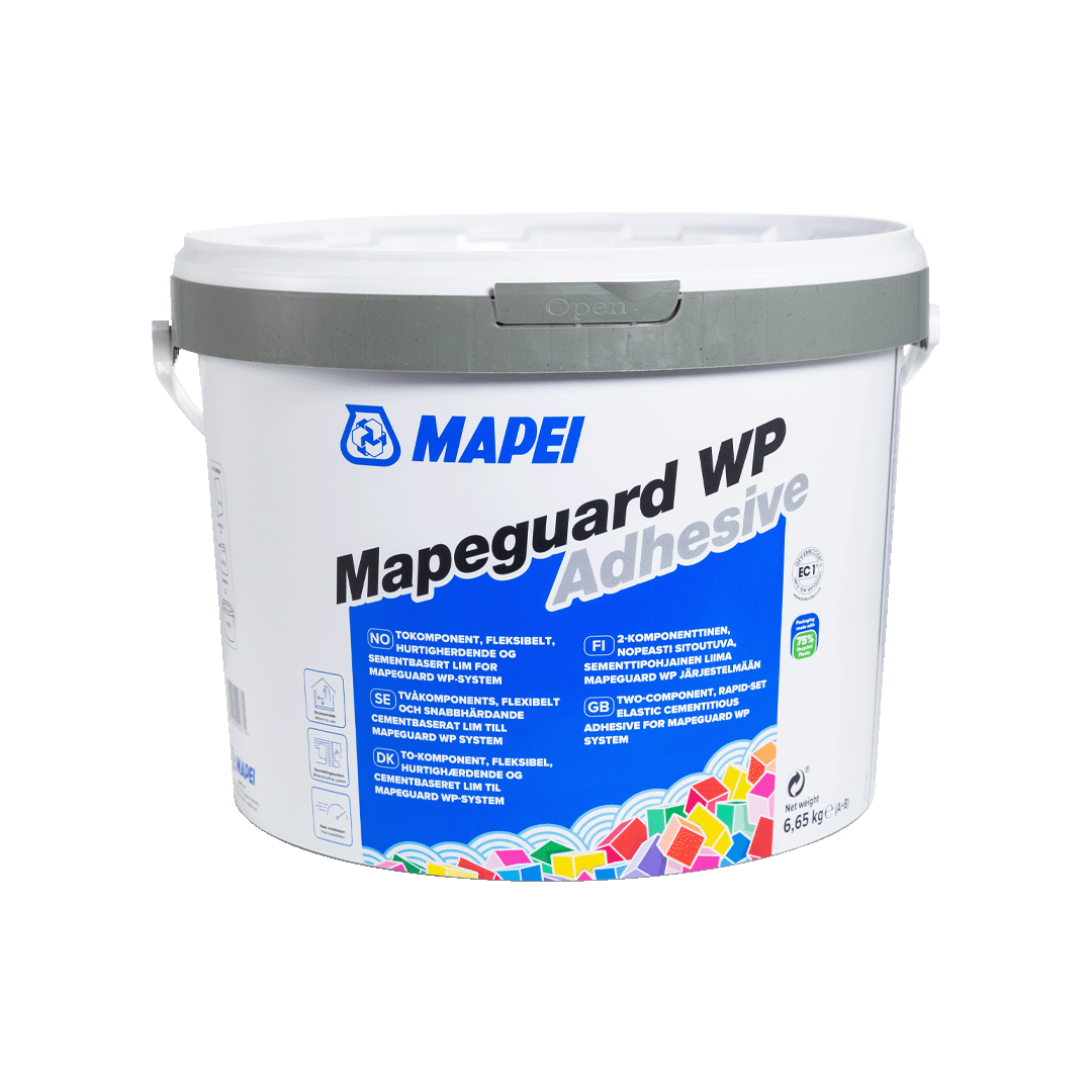 Mapeguard WP Adhesive is a two-component, cementitious binder-based mortar with fine-grained selected aggregates, special admixtures and synthetic polymers in water dispersion. It is a rapiddrying elastic cementitious adhesive for bonding and sealing overlaps of Mapeguard WP 90, Mapeguard WP 140, Mapeguard WP 200, joints between adjacent sheets of Mapeguard UM 35 with Mapeband Easy and the relative special pieces.