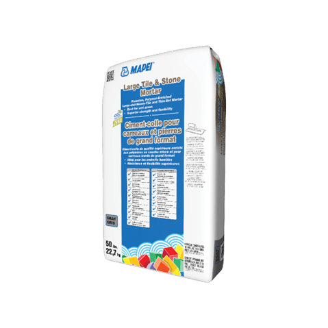 Large Tile & Stone Mortar gray is a premium, regular-setting, polymer-enriched (“modified”) large-and-heavy-tile mortar that is ideal for installing large-format tile and stone on floors, walls and countertops.
