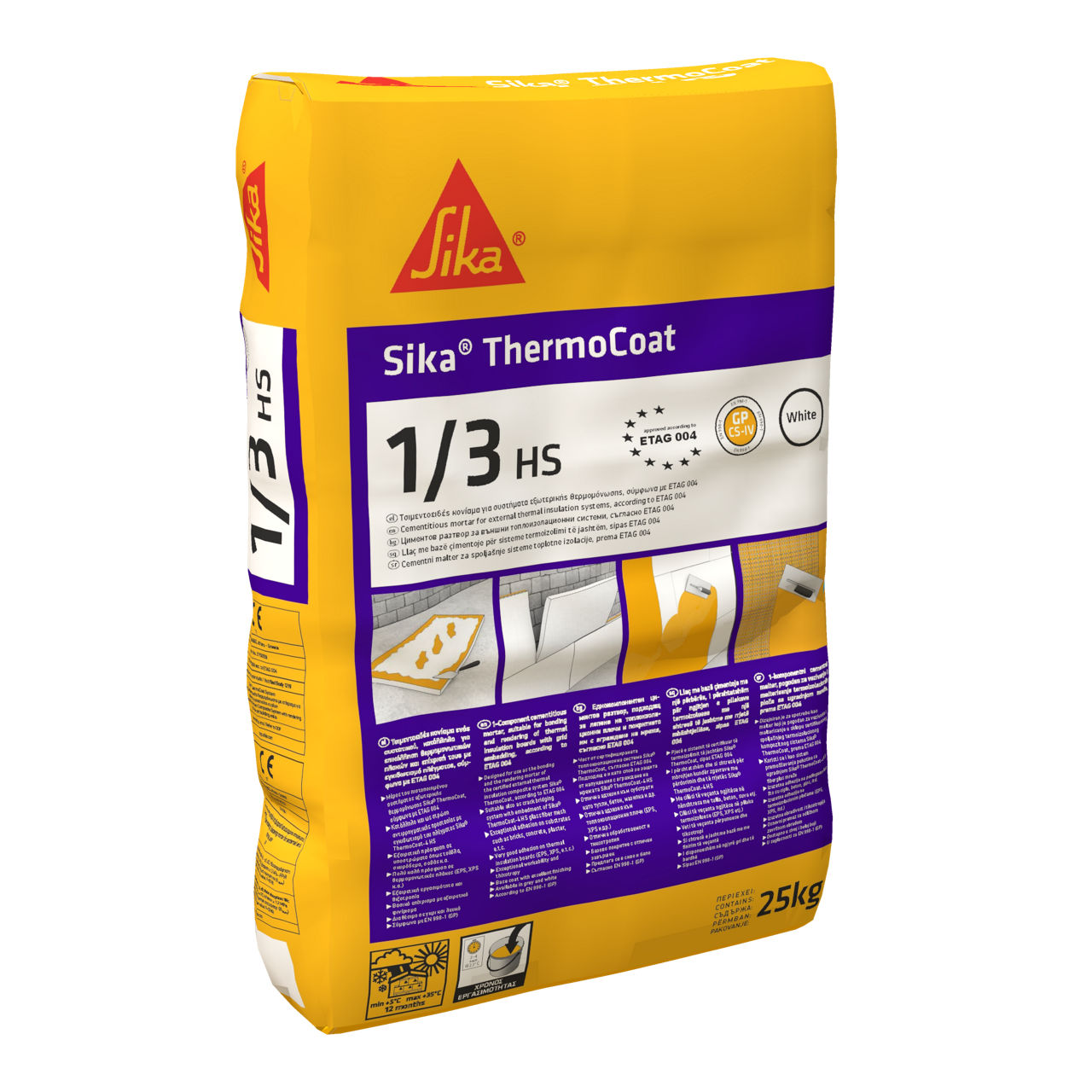 Sika ThermoCoat®-1/3 HS (White) is a one-component, cementitious, fiber-reinforced mortar, suitable for bonding and rendering of thermal insulation boards with grid embedding.