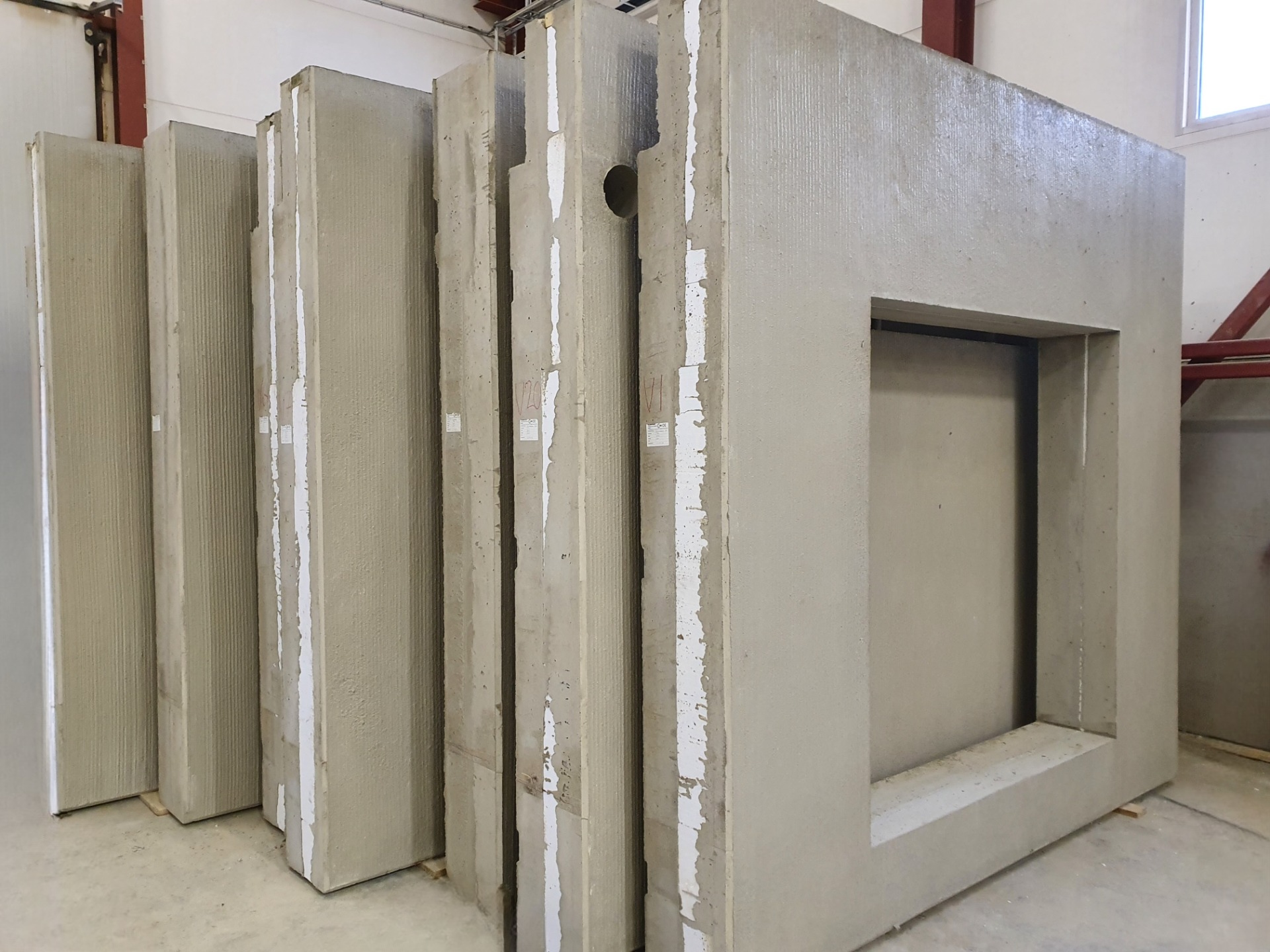Prefabricated concrete sandwich wall with concrete strength class C35/45 and exposure class XD3/XF4, insulated with expanded polystyrene insulation. Used for building houses or other structures.