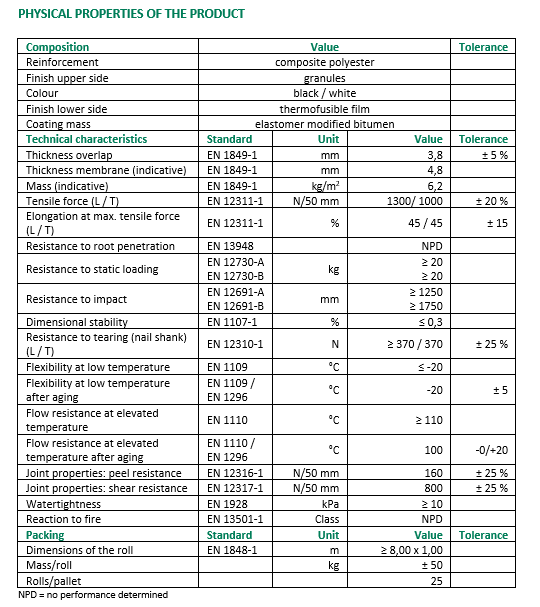 Membrane composed of elastomer modified bitumen with fire retardant additives and a composite polyester reinforcement. Used as an upper layer within a multi layer waterproofing system where fire retardant properties are required. The upper surface is finished with granules and the overlap is protected by a thermofusible film. The lower surface is protected by a thermofusible film.