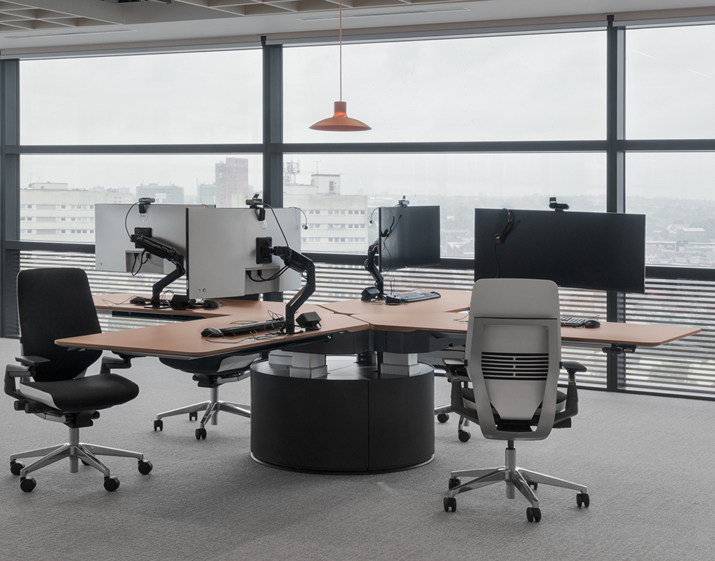 The iSatelliti S/200 Collaborative workstation system consists of electrically adjustable in heights assembled in a 4 elements desktops composition.