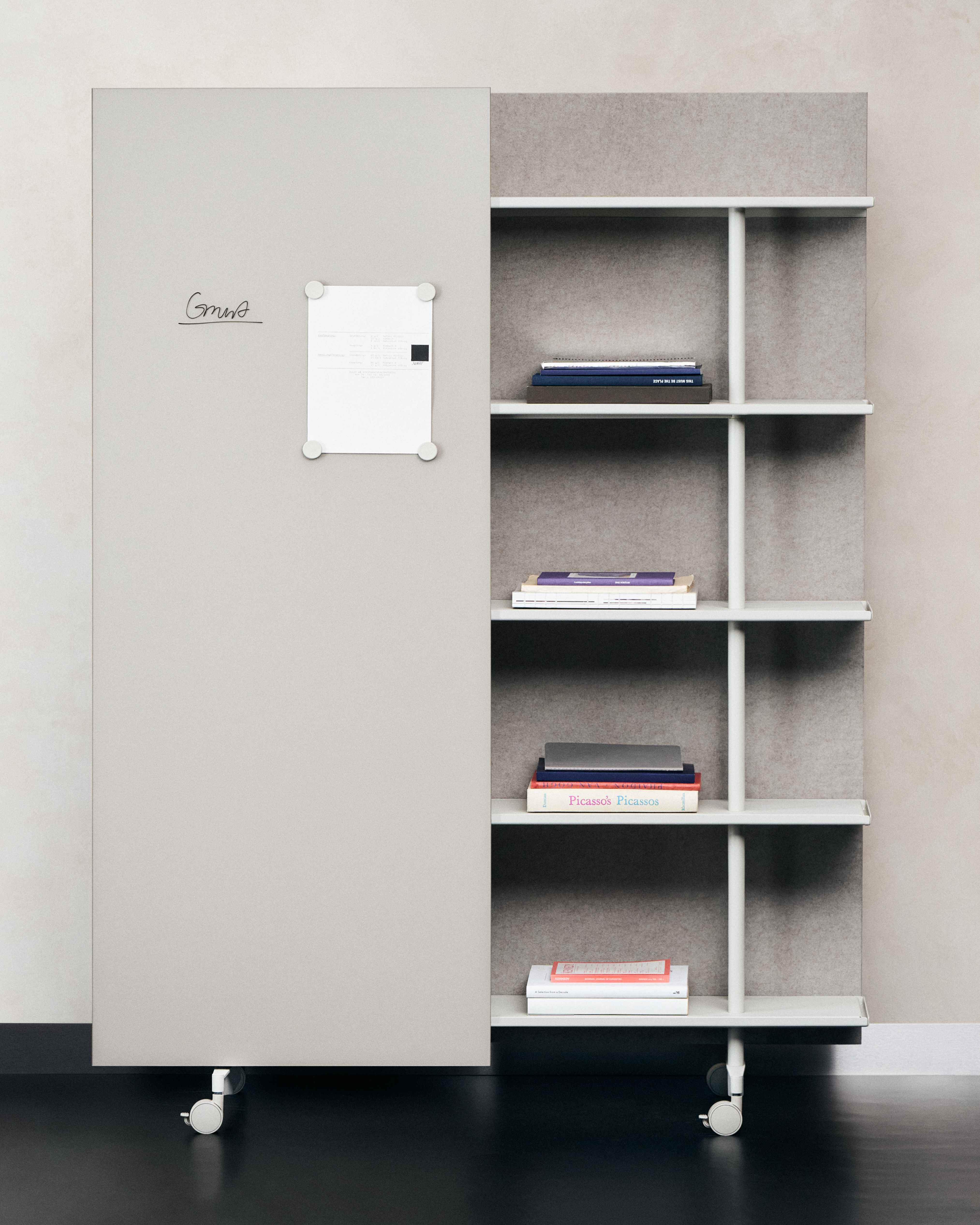 It consists of a soft grey or black, non-fingerprint, powder-coated shelf and two glassboards with a felt backside. The writing surface is either MOOD- or matte SILK-GLASS®, available in 24 colours.