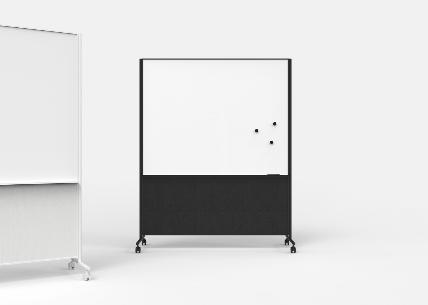 A double-sided whiteboard featuring two magnetic ceramic steel writing surfaces and a textile-clad sound blocker underneath. The pen tray accommodates numerous pens and accessories, while also protecting the fabric below.