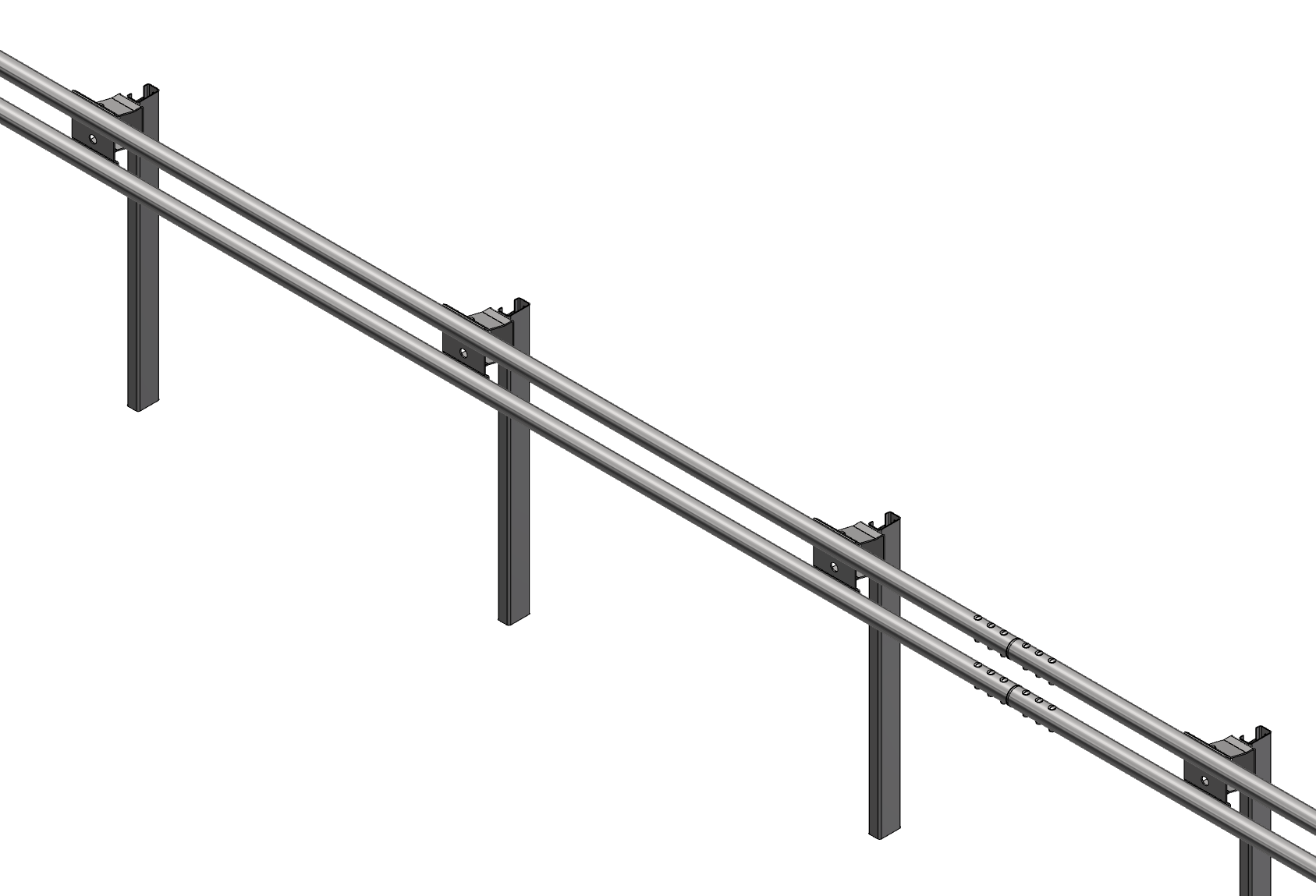 Safety barrier with pipes fixed at distance element and C120 post installed in soil or with base plate on concrete. Ground surface at installation site: gravel, asphalt, concrete etc.
