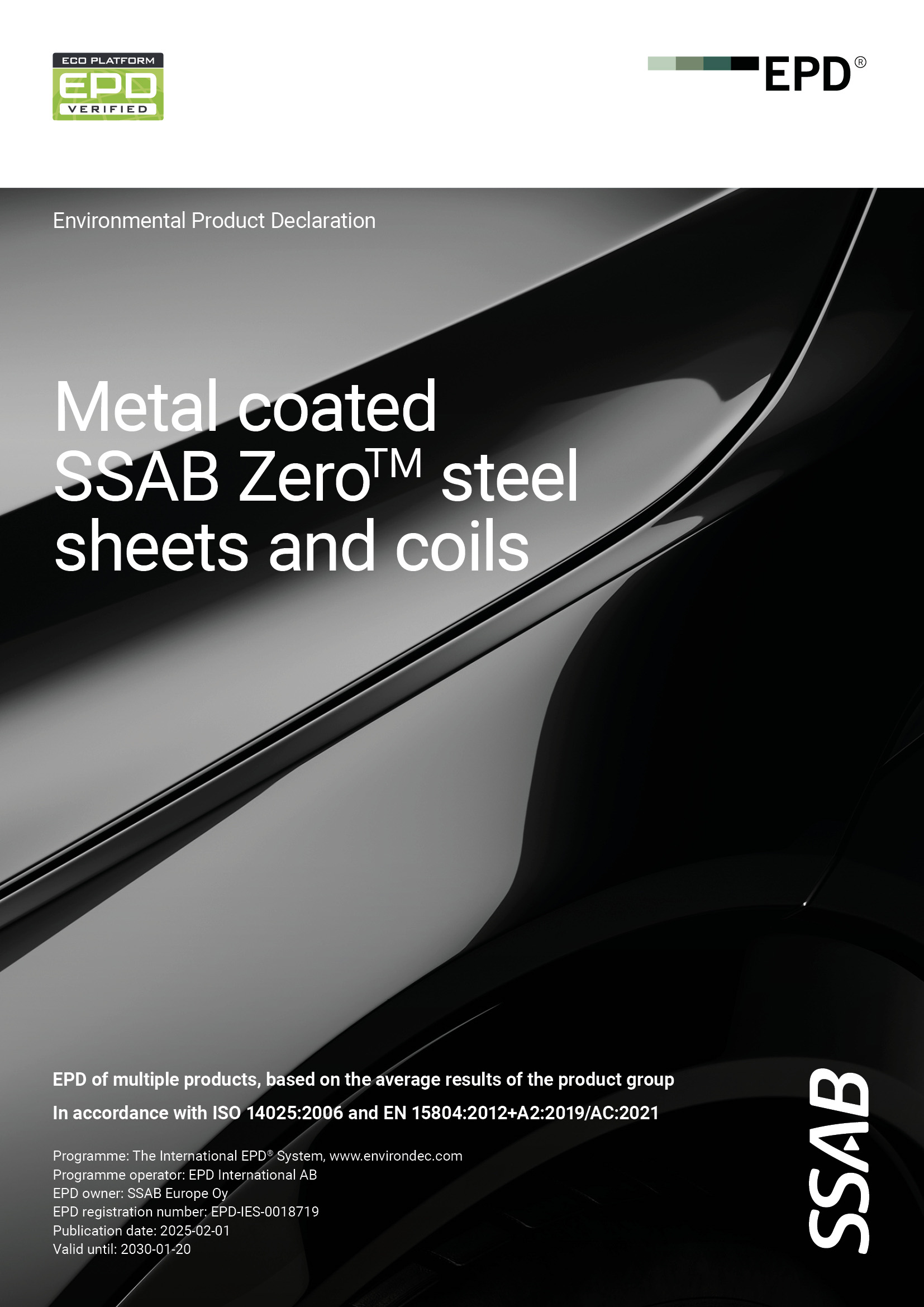 The scope of this EPD is metal coated SSAB ZeroTM steel sheets and coils. SSAB ZeroTM is made using 100 % recycled steel, of which over 90 % comes from external scrap (post- and pre-consumer) and the remainder from internal scrap from the manufacturing process.