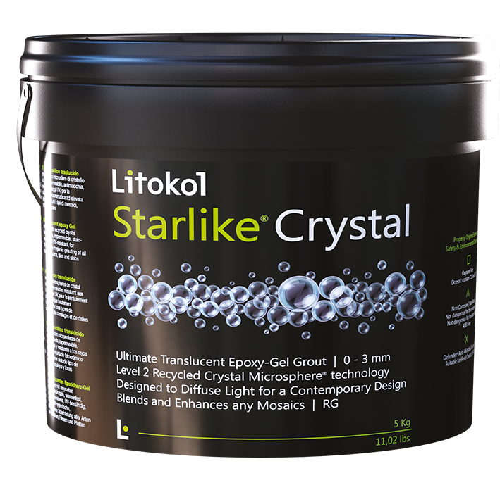 Translucent epoxy Gel enhanced with recycled crystals microspheres, impermeable, stain-resistant and UV-resistant, for grouting transparent and artistic glass mosaics with joints up to 3 mm in width. Classified as RG according to EN13888.