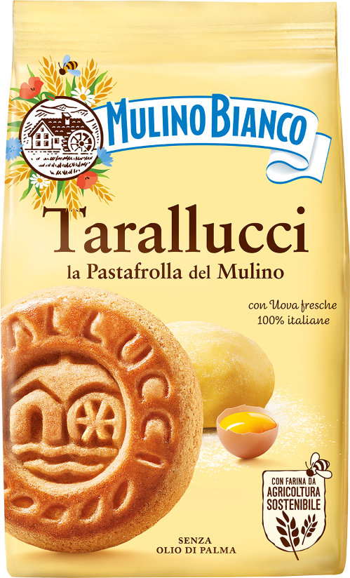 Tarallucci are Italian biscuits with fresh eggs, they are produced in the Barilla bakery plants of Castiglione delle Stiviere (MN), where a typical bakery process takes place. Tarallucci are packed into 300, 350, 800 and 1000 grams formats and are ready for consumption. For more information about the product see https://www.mulinobianco.it/tarallucci.