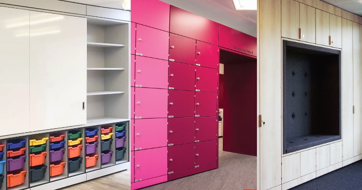 Storagewall provides high quality, efficient storage solutions through flexible modular style design. Storagewall units are constructed from 22 mm MFC board and are available in modular widths (400, 500, 600, 800, 1000, 1200 mm) and depths (430, 500, 600 mm) with variable heights to suit ceilings up to 2790 mm, or higher on request. Storagewall units are fabricated for each individual project and specification. The different unit types can be organised as desired, against a wall or as a room divider, and can be further enhanced with pinboard fabric backs, writeable surfaces and graphics. External panels made from 18 mm MFC with 2 mm radius ABS edging can be supplied in a selection of finishes. Teachingwall is based on Storagewall, but with additional options and features. The configurable options of Teachingwall include wide alcoves for smart screens, writable sliding doors, gratnell tray storage, desk extensions, and more. Safety features include replacing the standard concealed hinges to exposed knuckle hinges, so that doors can open fully to 180 degrees, making them unobtrusive.