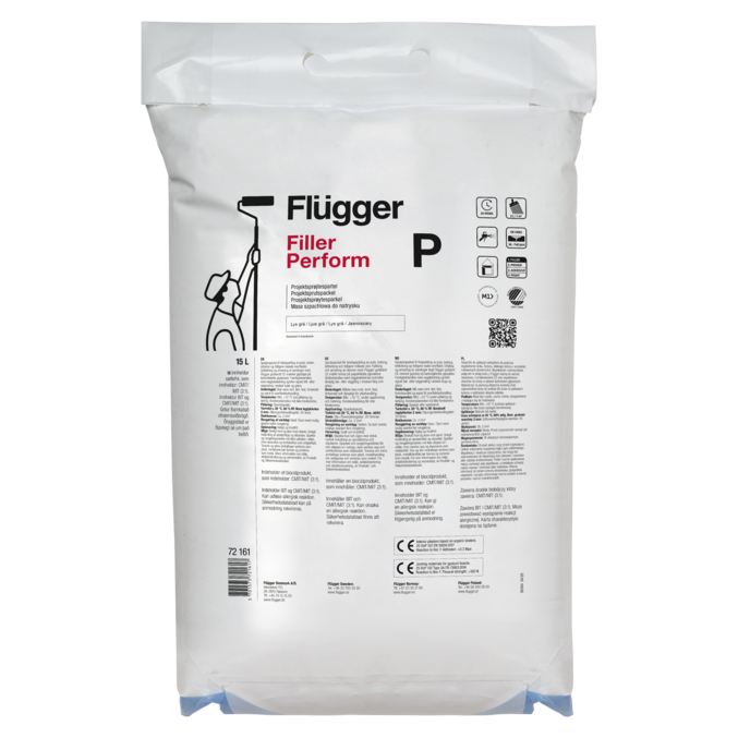 Spray filler for filling out on plaster, concrete, lightweight concrete and previously painted surfaces. Filling and reinforcing of joints with Flügger approved CE labelled gypsum tape and filling screw holes on gypsum plasterboard. Finish treatment with a wall covering and/or suitable ceiling or wall paint in the desired colour and gloss.