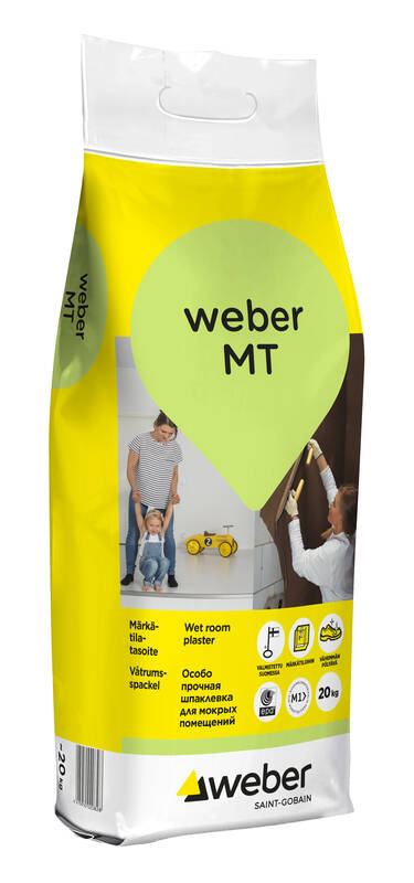 weber MT Wet room plaster is cementitious plaster for levelling and straightening the walls and ceilings of dry and wet rooms. The product may correct up to 10 mm of layer thickness at a time. The product is used in wet room levelling prior to waterproofing and tiling, or levelling spaces where a stronger than normal levelling surface is required. Suitable substrates are masonry surfaces such as brick, concrete, lightweight concrete and Leca block surfaces, plasterboard surfaces and strong plaster surfaces which have been plastered with weber 410 Thinrender, weber TT+ Filling plaster or weber 414 Unirender plaster.