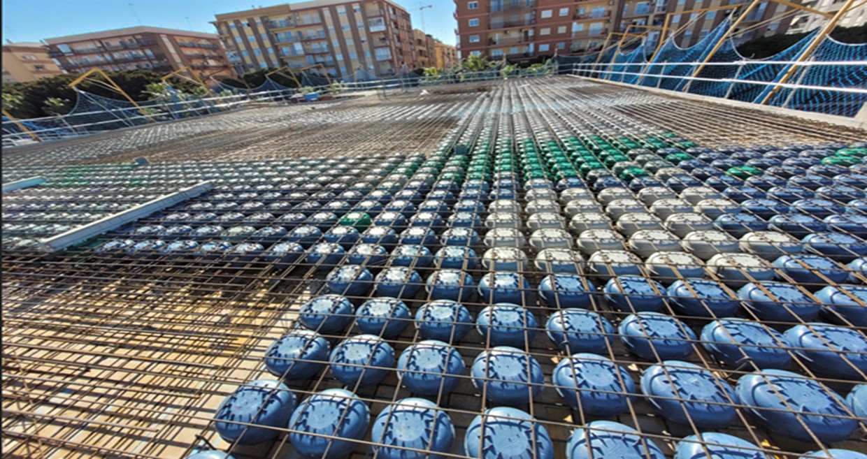 System for lightened concrete slabs including structural hollow bodies (CHE®) made of 100% recycled plastic.