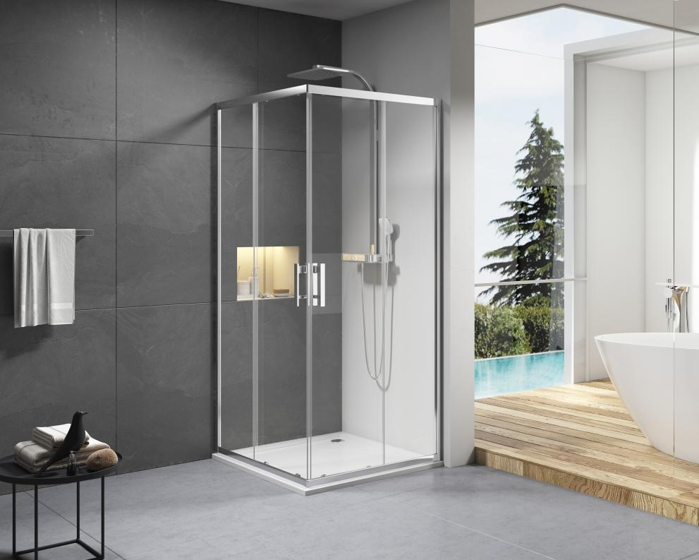 This shower enclosure, model NDC90X with bright chrome finish, features single-sided easy-clean functionality. Its dimensions are 870*870*1950mm.