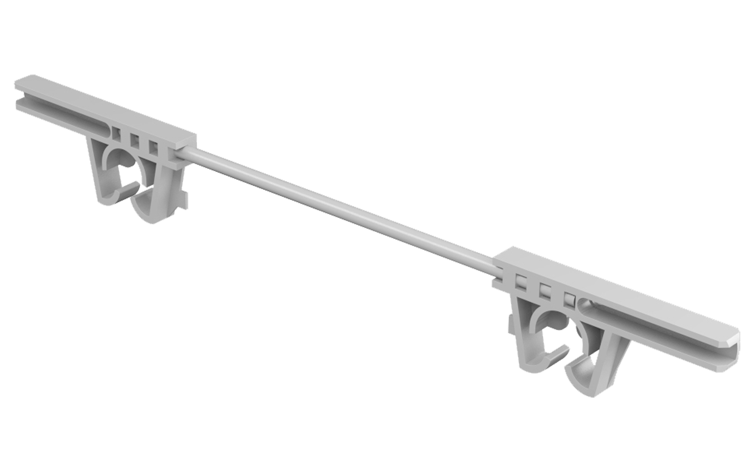 - Mesh connector spacers – characterised by a metal rod to which elongated plastic clip-on spacers are attached at either end; used to connect two reinforcement meshes at a defined distance while at the same time realising concrete covering between reinforcement mesh and formwork