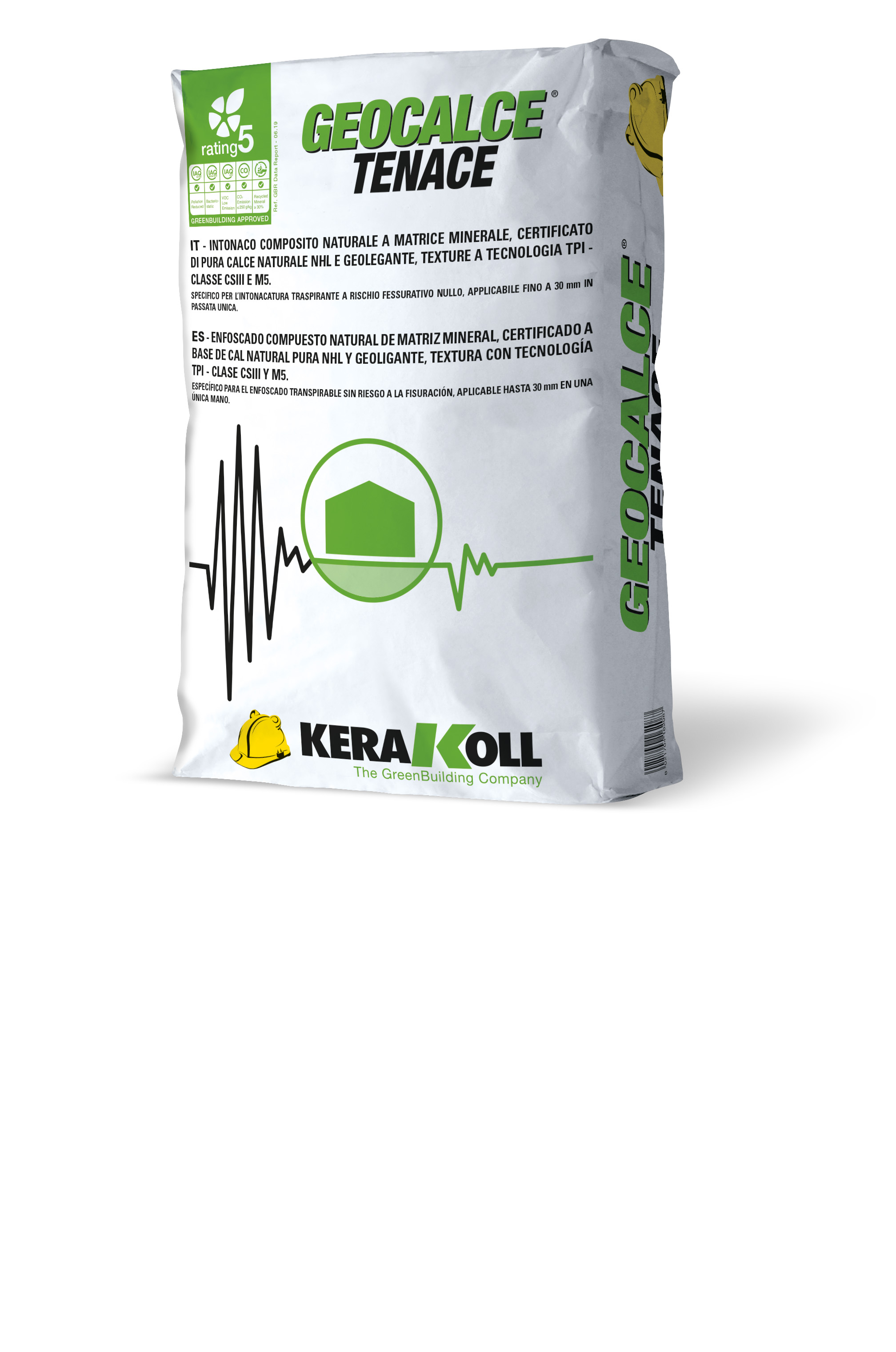 Geocalce Tenace is a composite, natural, mineral-matrix technical plaster/render formulated with pure natural NHL lime and a geo-binder. The product includes a TPI 3D texture and is intended for high-thickness plastering and rendering applications. It can be applied in a single coat with thicknesses up to 30 mm. The product is classified as CS III according to EN 998-1 and as M5 according to EN 998-2.