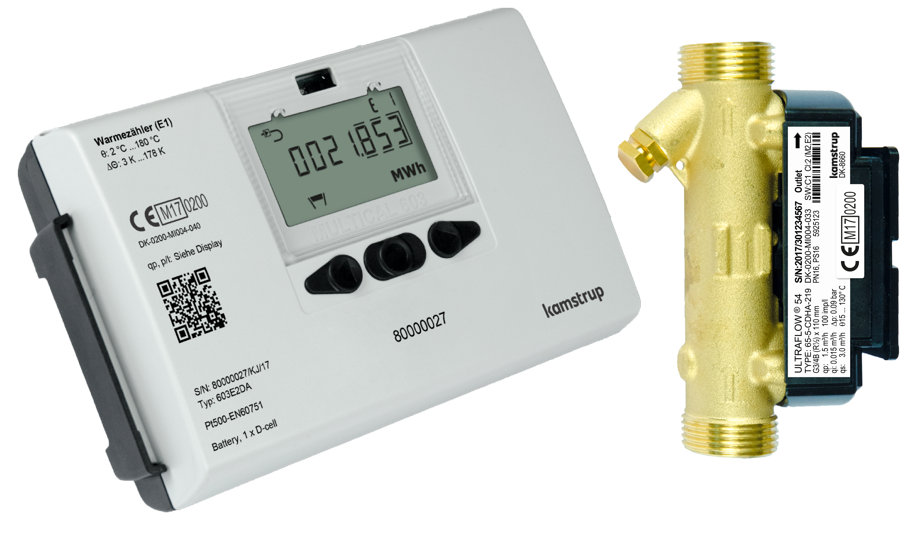 MultiCal 603 UF54 is a modular thermal energy meter consisting of a calculator unit, ultrasonic flow sensor, paired temperature sensors, a communication module, and a battery power supply. The system measures thermal energy in water-based heating and cooling installations.