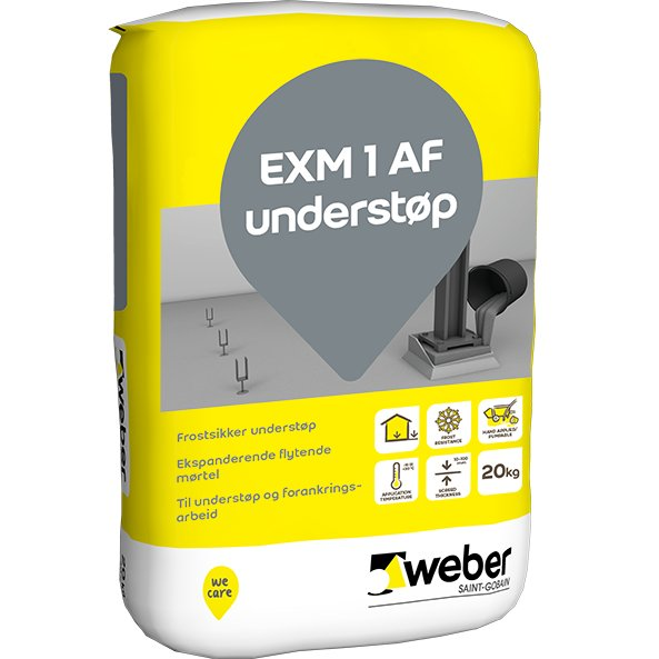 weber EXM 1 AF is a non-shrink, fluid mortar for underfilling and anchoring applications with a maximum grain size of 1 mm. Suitable for use at temperatures below 0 °C. It contains cement, fillers, additives, and natural sand. The mortar should only be mixed with water to achieve a free-flowing and pumpable consistency. The mix has a long open time and is suitable for pumping operations.