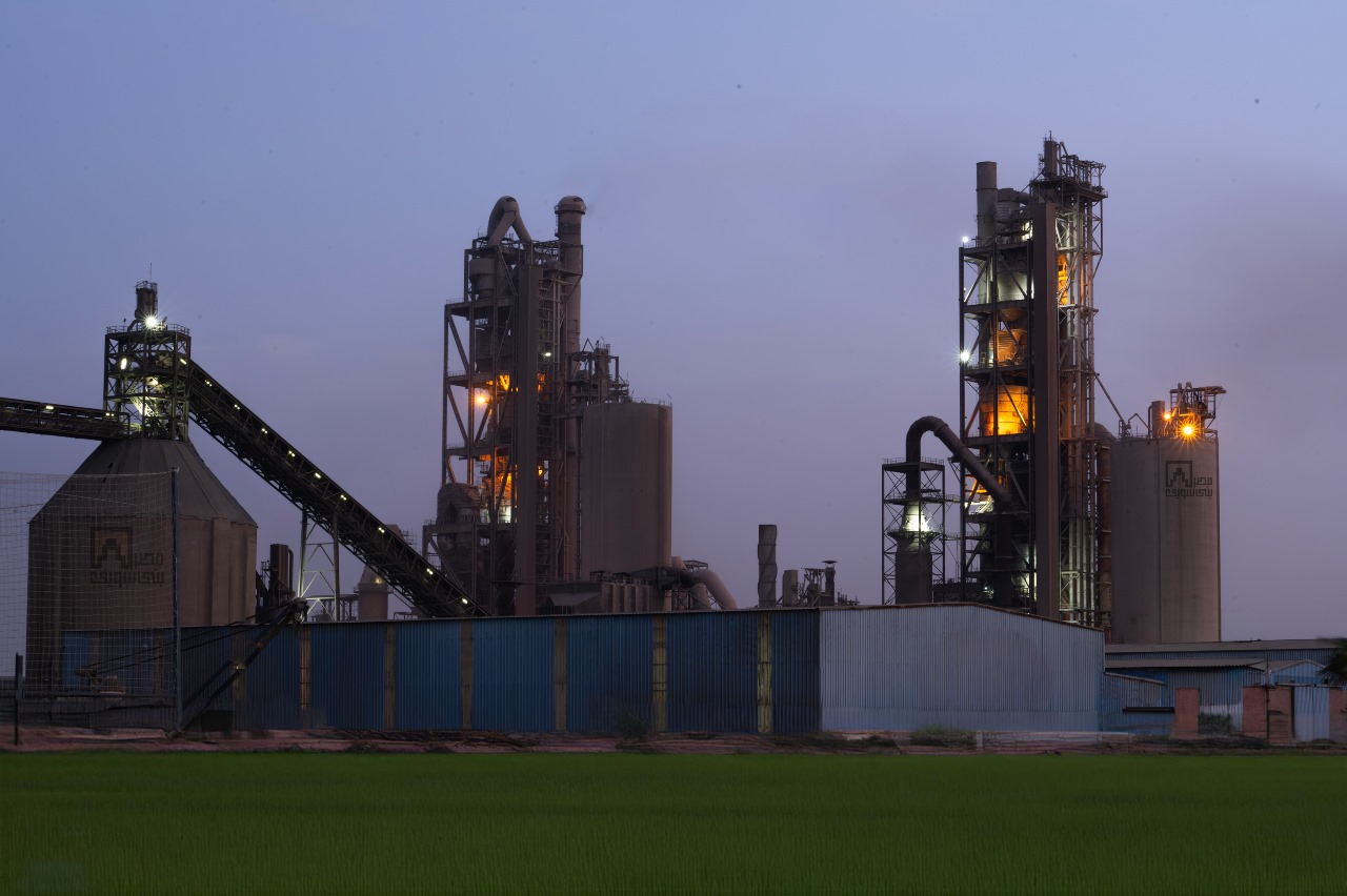 sand, and gypsum), clinker production in rotary kilns operating at approximately 1450 °C,