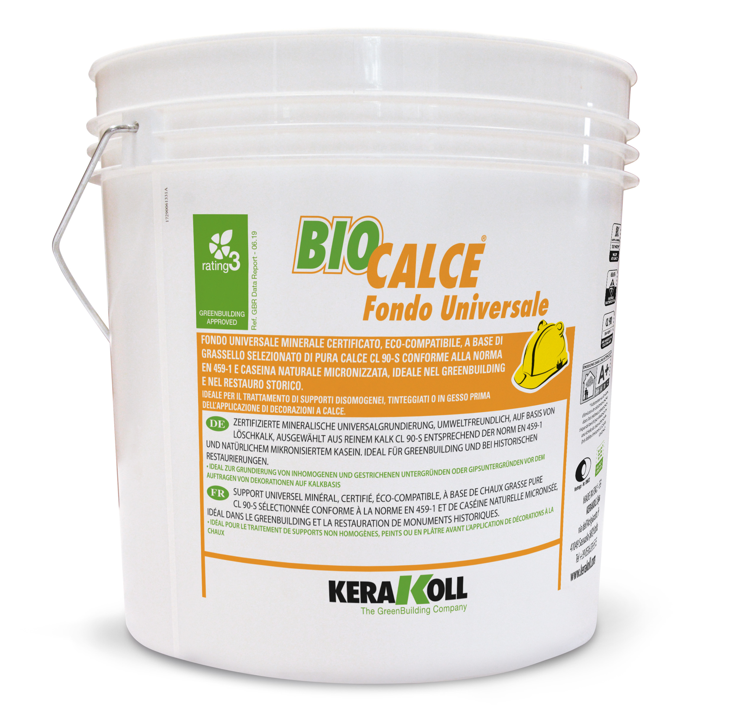 Biocalce Fondo Universale is a certified, uniforming universal mineral coat made from selected pure CL 90-S lime putty compliant with EN 459-1 and natural micronized casein. It ensures adhesion of lime-based decorative cycles on plaster surfaces or surfaces coated with synthetic paints, without altering their material appearance. The use of lime putty supports conservative interventions, respecting existing structures and original materials.