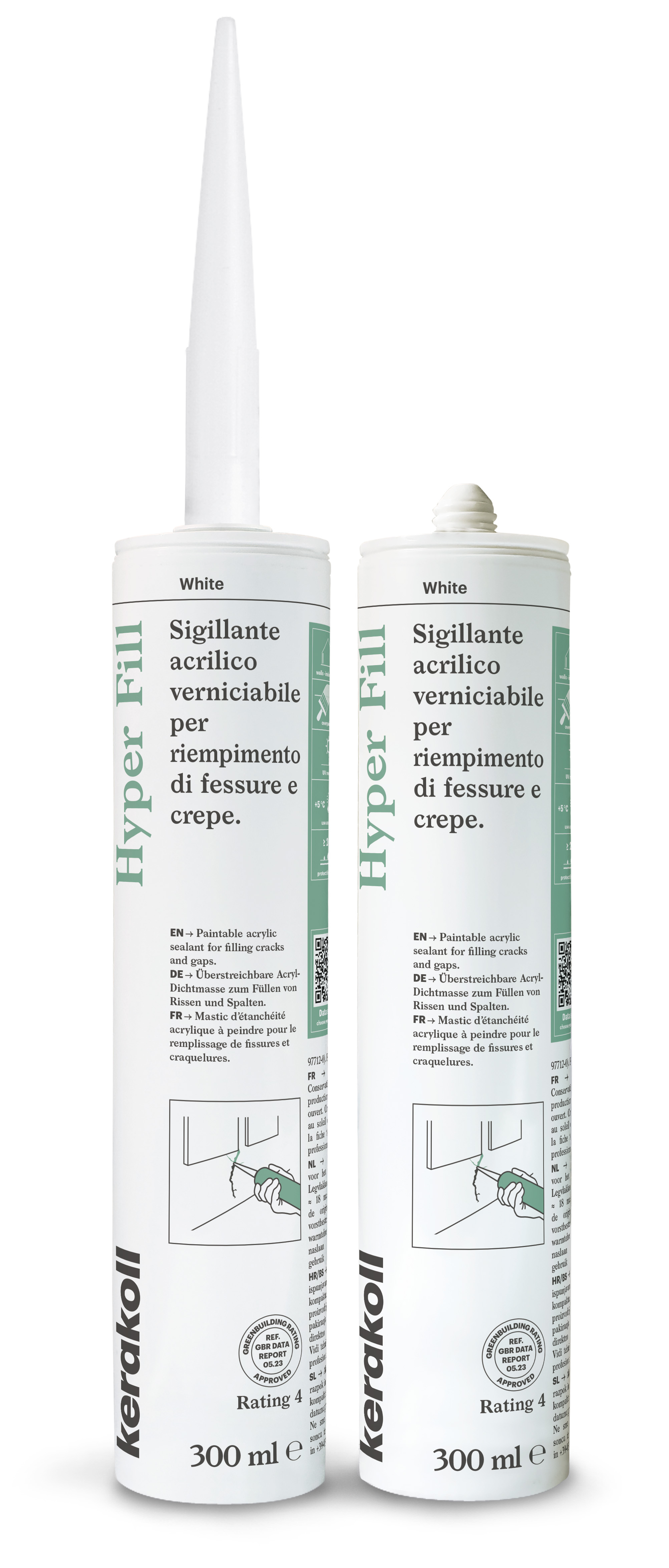 Hyper Fill is a paintable, acrylic-based sealant intended for filling cracks and gaps in building substrates. It is formulated for sealing connection joints between masonry or plaster/render and door or window frames before varnishing, and for the localized repair of surface cracks. The product is soft to extrude, provides a smooth surface finish, and cures rapidly. Its formulation ensures stability under UV exposure, allowing use in both internal and external applications where a paintable, deformable sealant is required.