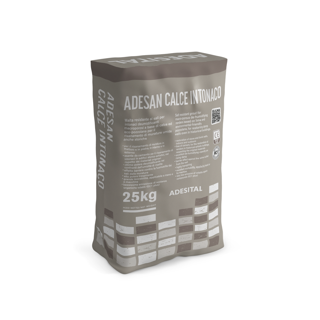 Adesan Calce Intonaco is a salt resistant grout for macro-porous de-humidifying renders based on lime and environmental-friendly pozzolana for restoring damp walls even in historical buildings. Very low VOC emissions (EC1 plus).