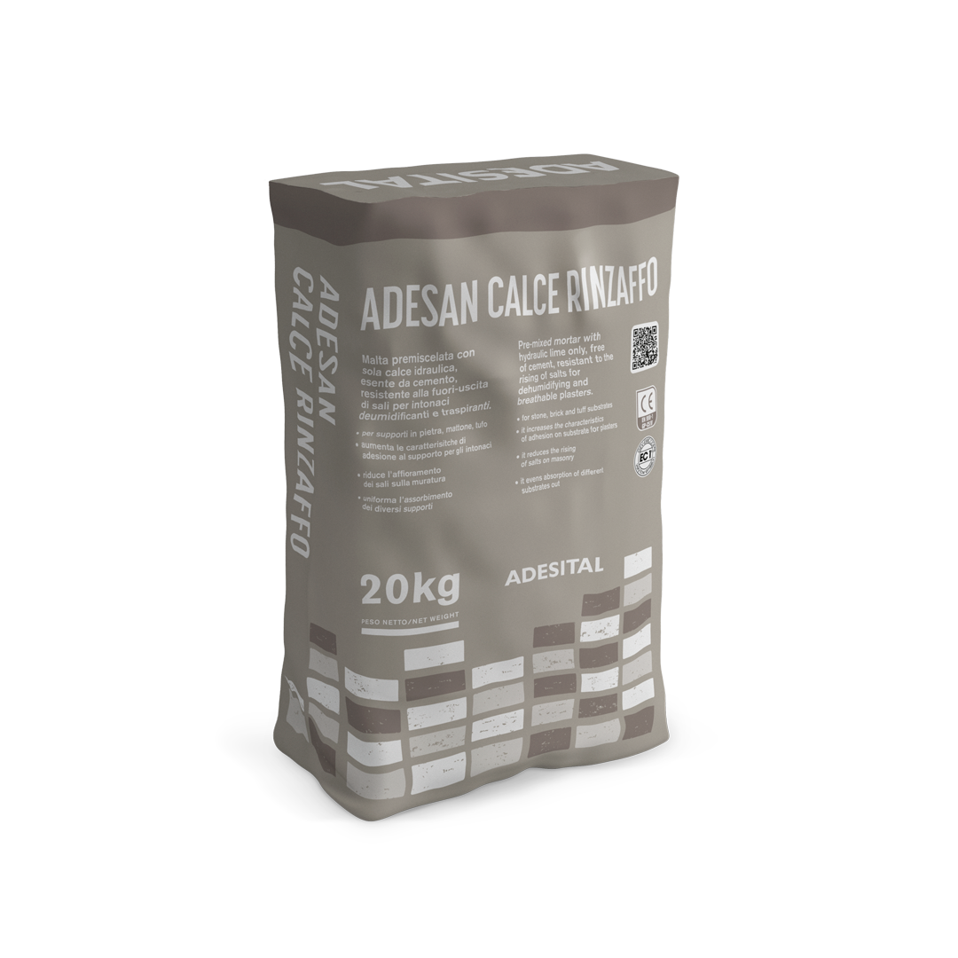 Adesan Calce Rinzaffo is a coarse grain grout based on traditional lime and pozzolana, anti-salt additives and bonders for damp substrates. It is particularly suitable for the restoration of historical buildings thanks to its porosity, elastic module and mechanical performance, similar to those grouts used in the past. Excellent adhesiveness on all brick substrates. Barrier effect against the saline outlet from the wall.