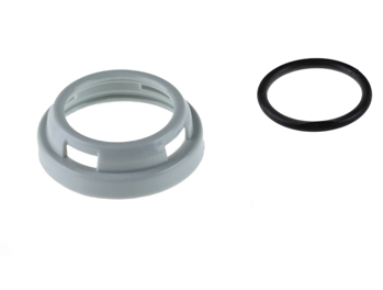 The characteristic for this press fitting is that there are no holes in the steel socket and the plastic ring has slitted holes.