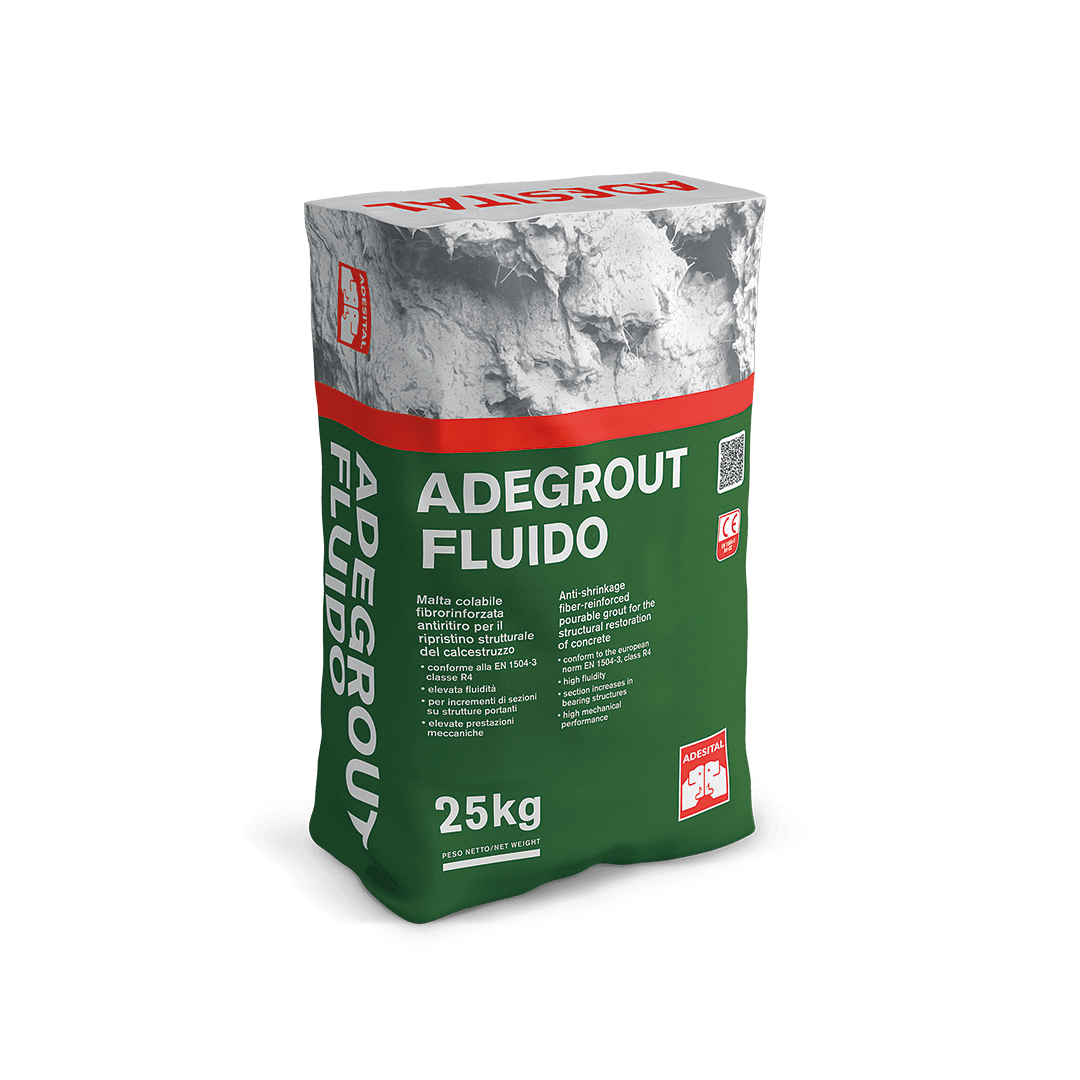 Adegrout Fluido is a fluid anti-shrinkage fiber-reinforced grout for the structural restoration of concrete.