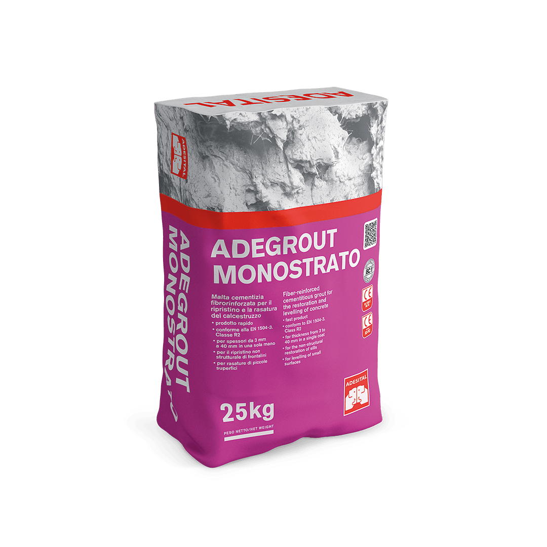 Adegrout Monostrato is is a single-layer cementitious grout for the final restoration and levelling of concrete in one single passage. Fiber-reinforced, thixotropic, with rapid setting. The product is based on special cements, selected fine grain aggregates, resins and anti-shrinkage additives. Ideal for non-structural repair of concrete, enabling thickness between 3 and 40 mm with high thixotropy values.