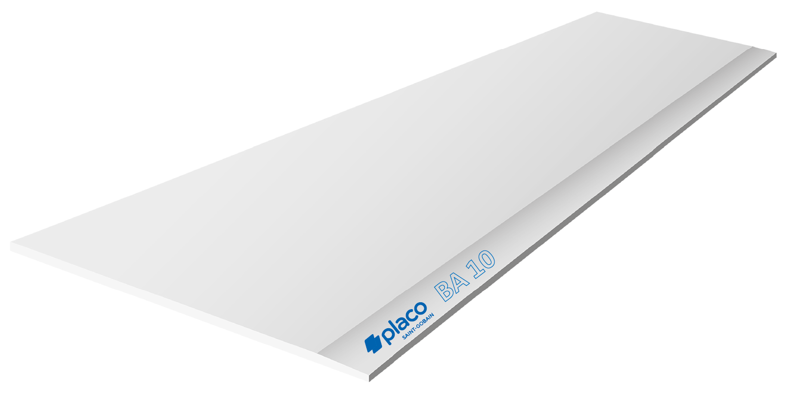 Plasterboard with double-sided cardboard and a core made of natural gypsum, 10 mm thick and 1,200 mm wide. Manufactured through a continuous lamination process with tapered longitudinal edges.