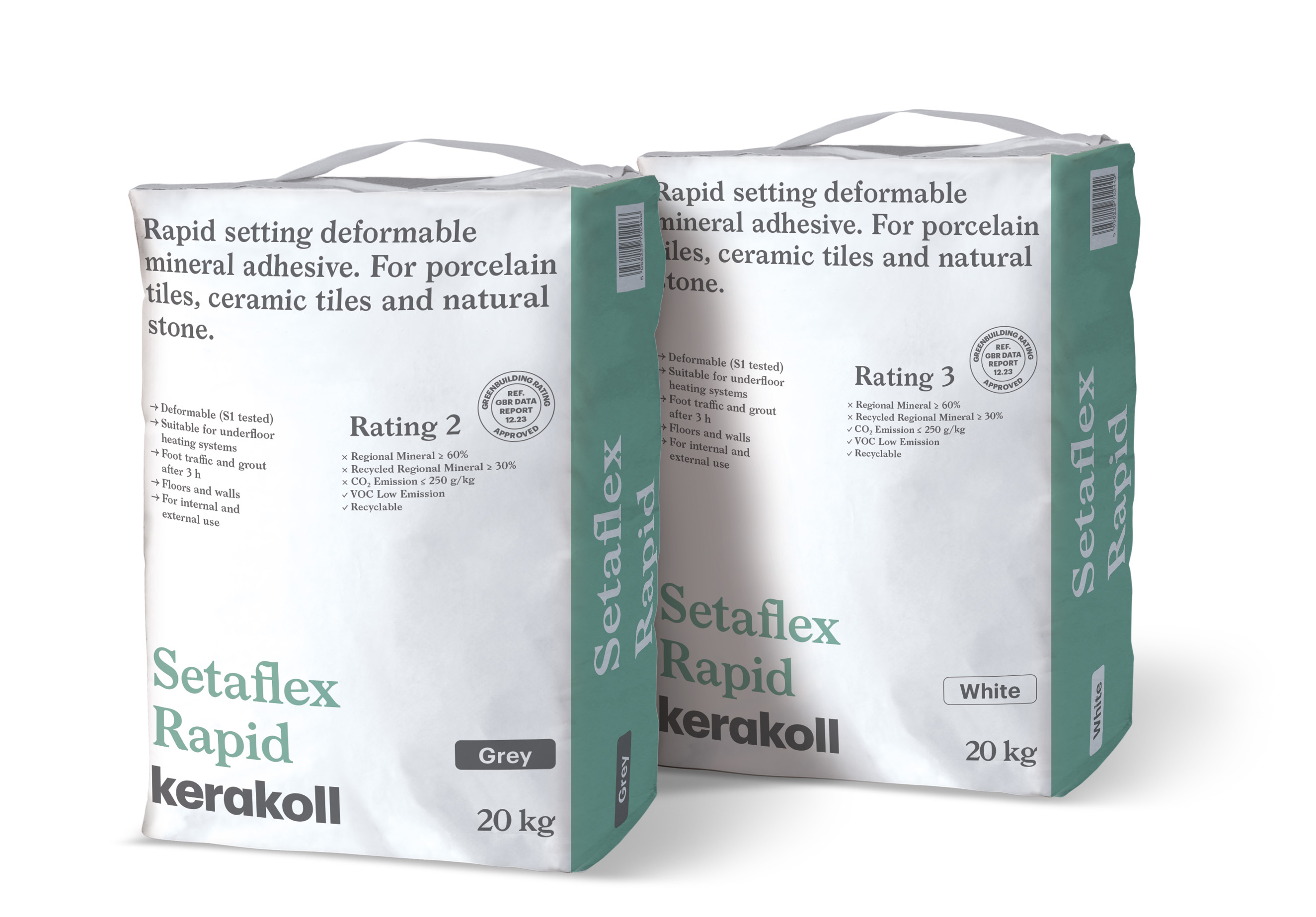 Setaflex Rapid is a rapid-setting deformable mineral adhesive suitable for porcelain tiles, ceramic tiles, and natural stone. It is deformable (S1 tested) and appropriate for use with underfloor heating systems.