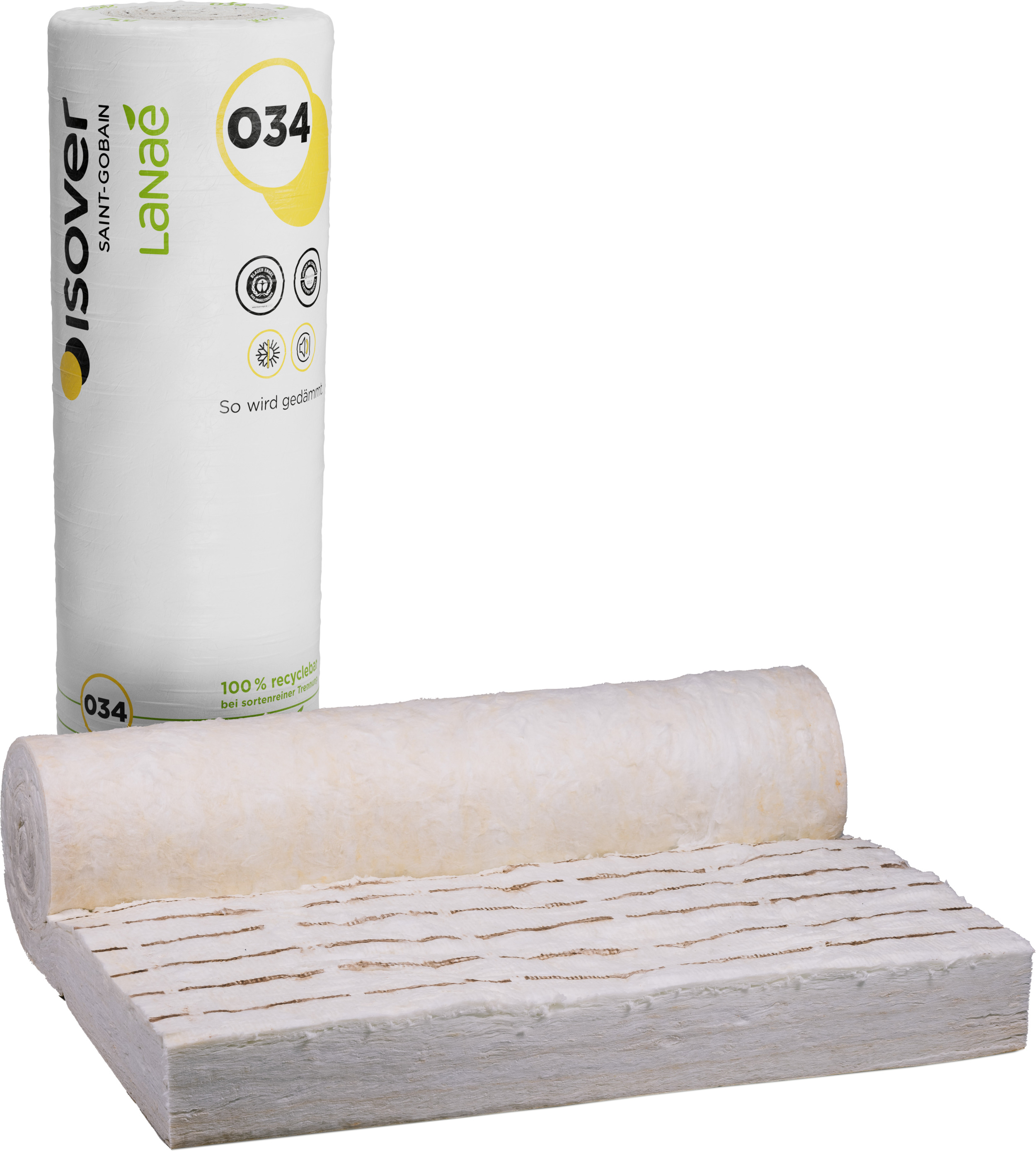 ISOVER Lanaé mineral wool, bound with a largely natural binder, based on substances from sugar and grain production, and manufactured according to the glass wool production process of SAINT-GOBAIN.