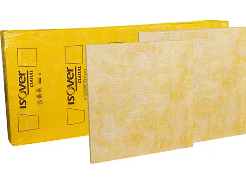 Rigid glass wool slab for external insulation on windproof frame. The insulation is placed behind the ventilated façade in a homogenous layer.