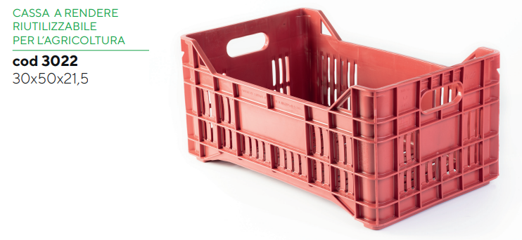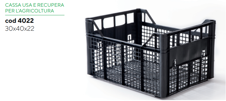 Le "casse riutilizzabili" sono realizzate utilizzando HDPEriciclato e vergine e garantiscono leggerezza e resistenza. Possono essereutilizzate più volte e per lunghi periodi e sono sovrapponibili edindeformabili. Sono disponibili in diversi formati con peso che va 0,900 kg a 3kg e portate da 8 a 45 kg.