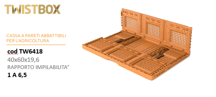 Le "casse speciali a pareti abbattibili ed impilabili" sono realizzatein PP vergine, possono essere utilizzate svariate volte e per lunghi periodi.Si caratterizzano per le pareti abbattibili ed impilabili che consentono unariduzione dei volumi di trasporto secondo un rapporto fino a 1:8 rispetto alle casse tradizionali.Disponibili in vari formati con peso da 1,1 kg a 2,15 kg e portate da 8 a 20kg.