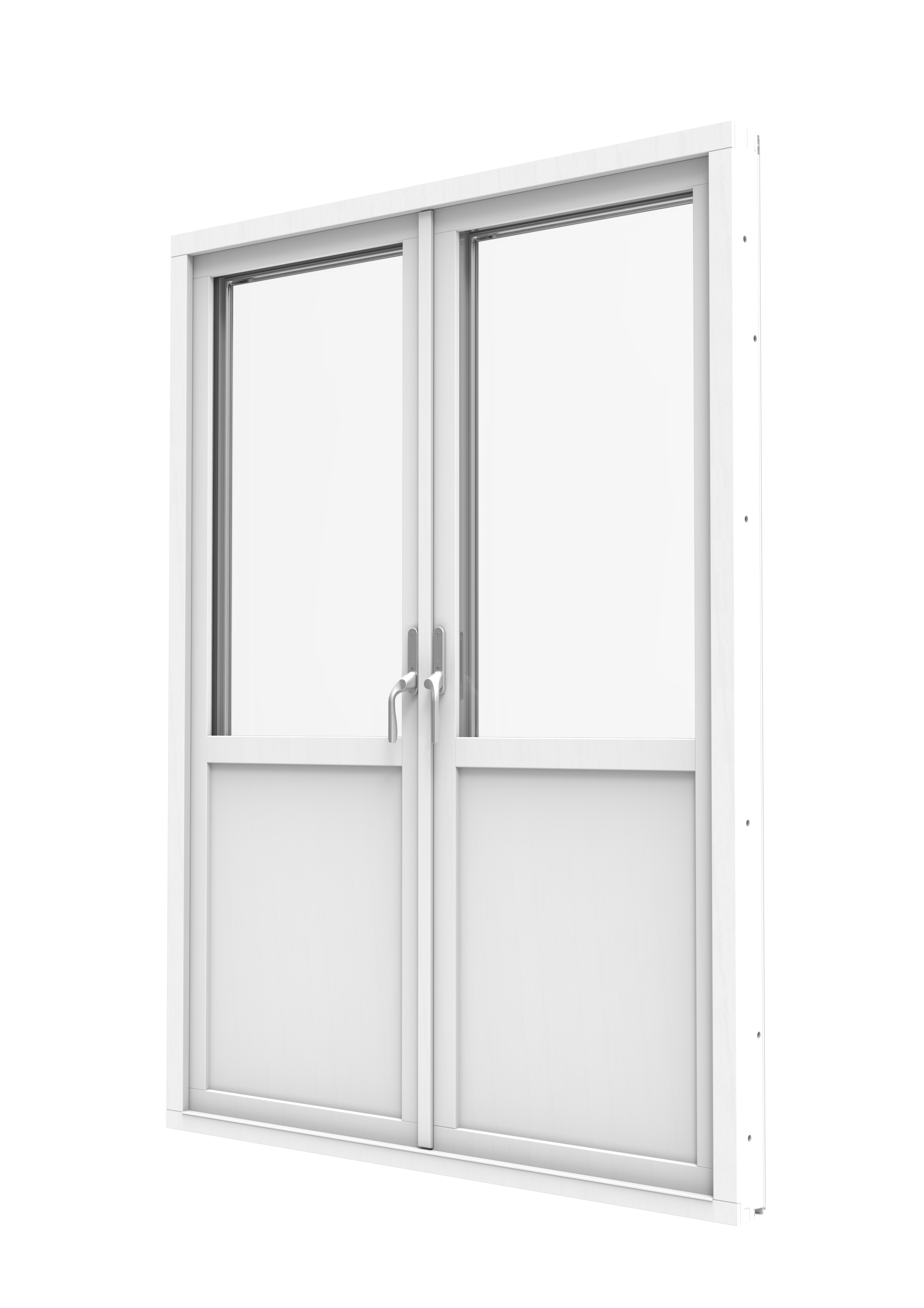 Elitfönster Harmoni Outward opening Balcony double doors 2+1 is a balcony door with two side hung sashes that opens outwards. The casement consists of two connected sashes, the inner casement consists of wood with a mounted insulating glass with two glasses and a filling, the outer casement is made of aluminum with a simple float glass and filling. The casement is attached to the frame via hinges on the side piece, which means that when opened, the casements swings outwards.