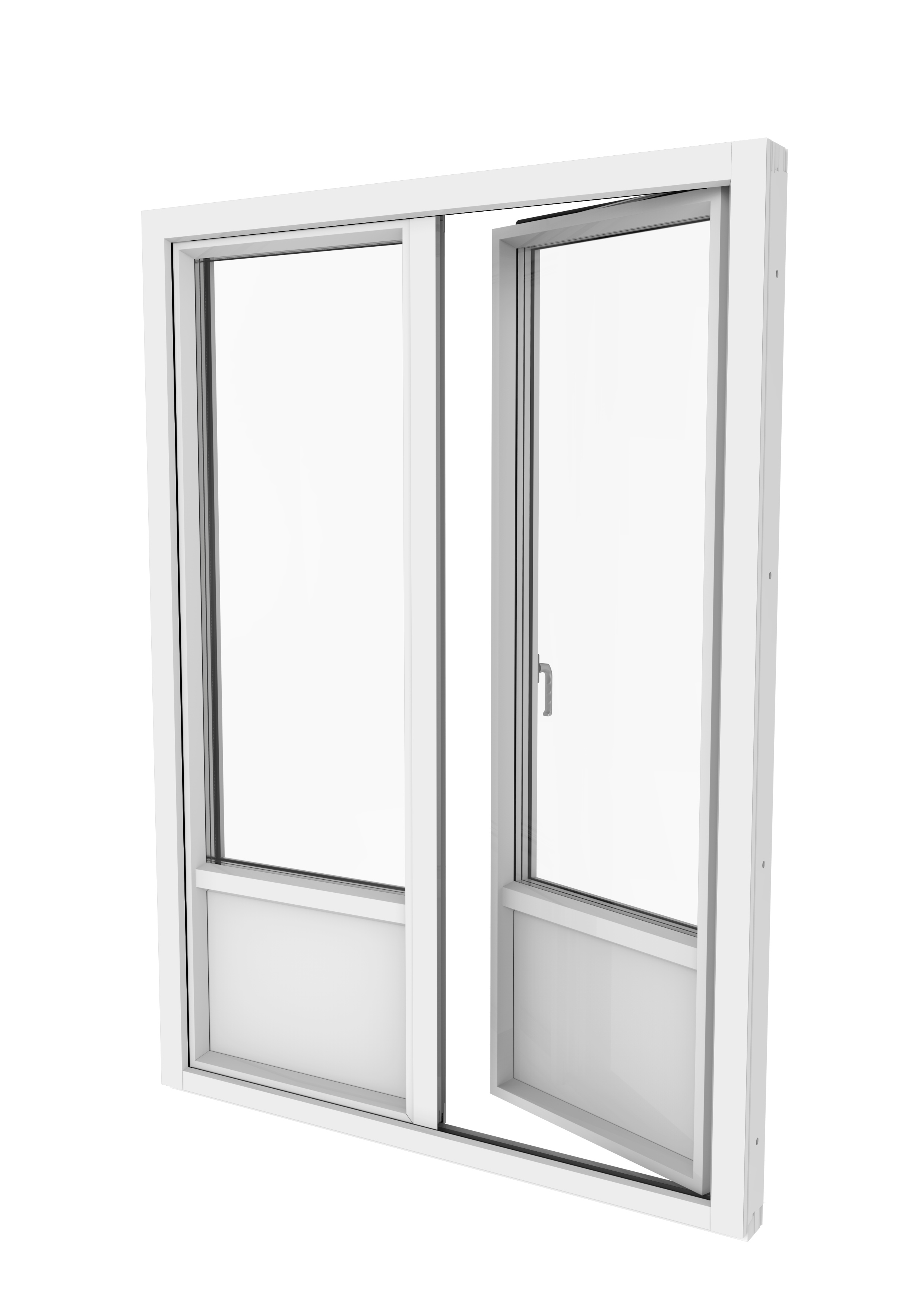 SSC Etri Fönster Balcony double doors 3-glass is a balcony door with two sside hung sashes that opens inward. The casement consists of wood with outer aluminum cladding and an insulating glass consisting of three glass planes and a filling. The casement is attached to the frame via bolt hinges on the side piece, which means that when opened, the casement swings inwards in a horizontal position.