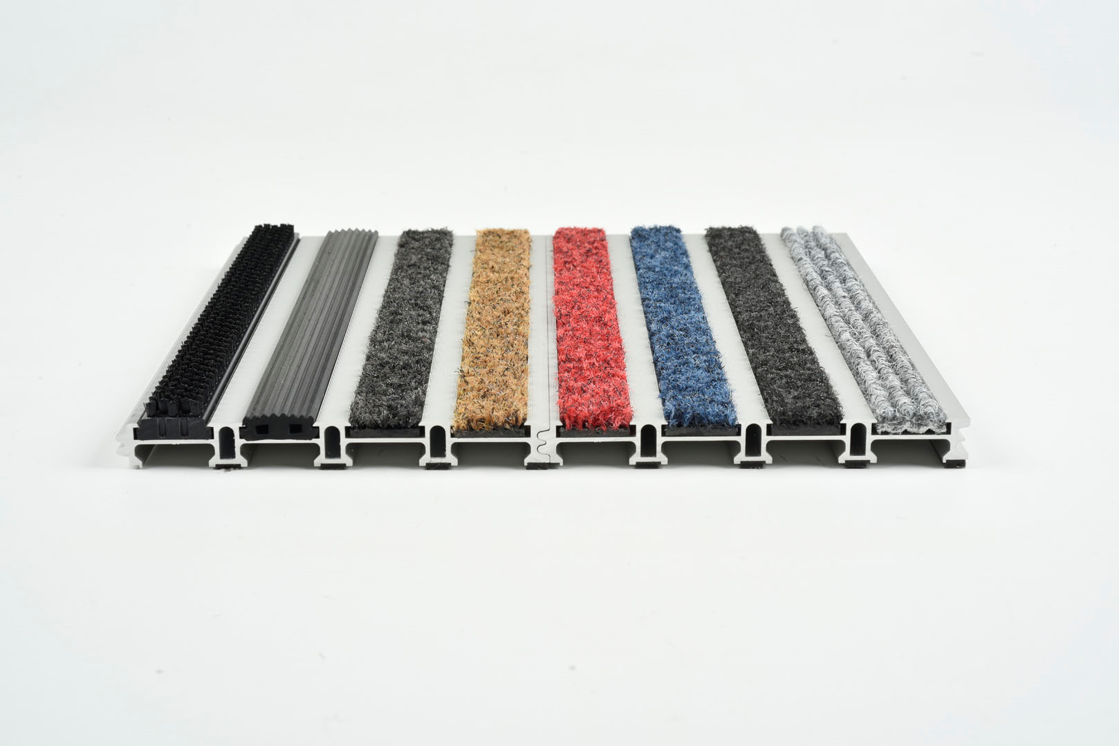 Entrance matting suitable for areas with heavy foot and wheeled traffic, such as Shopping Centres, Commercial Offices etc. Closed construction interlocking plank system using 100% recycled (29% post-consumer) aluminium construction as the base, with 100% Econyl fibre.