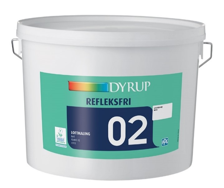 Dyrup Byg 05 is a matt wall paint based on plastic dispersion for indoor use with particularly good hiding power. Dyrup Refleksfri Loftmaling 02 is used indoors on ceilings. Gives a nice matt and homogeneous surface. The product is particularly suitable for ceilings in rooms with critical light incidence.