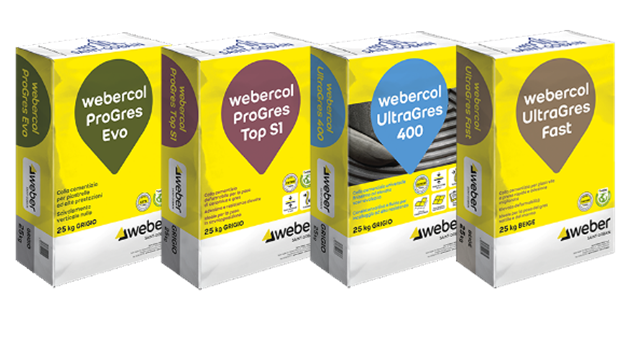 Grey cementitious tile adhesive webercol ProGres Evo webercol ProGres Top S1 webercol UltraGres 400 webercol UltraGres Fast