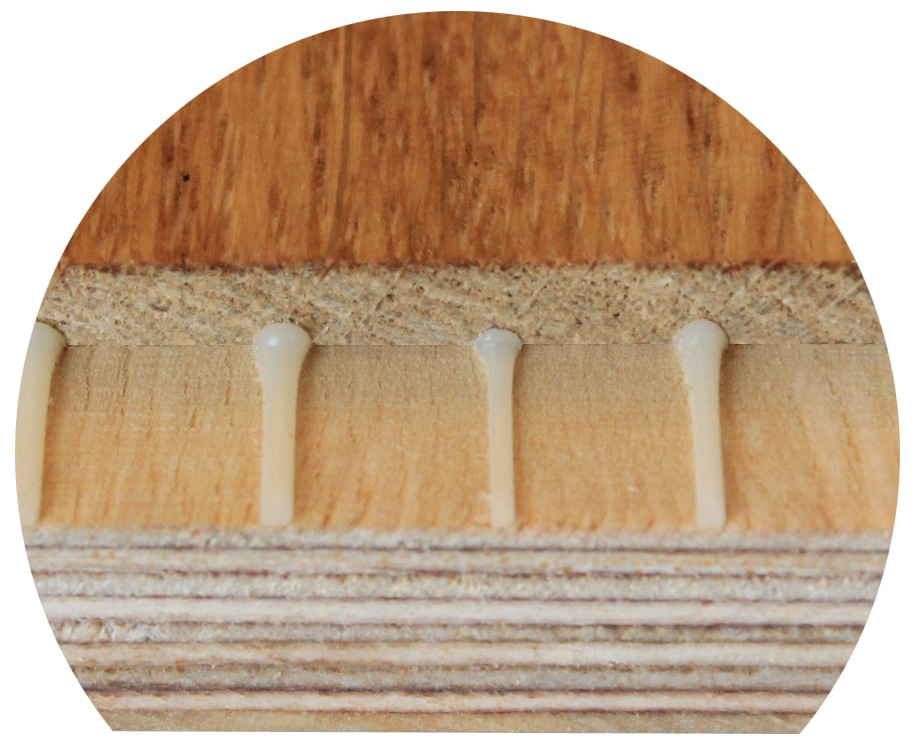 The boards of 4.5mm oak top layer and 12mm water resistant birch plywood are produced in widths from 210mm to 300mm. There are 6 different grades for customer selection. The plywood under layer design gives the board extra flexibility. Structural advantages are appreciated by parquet professionals in many countries.
