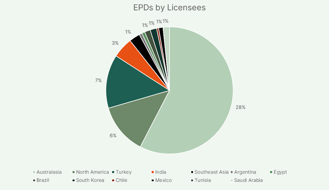 Among licensees, EPD Australasia emerged as the largest contributor, accounting for 2,739 EPDs (29.2%), underscoring the region’s advanced uptake of EPDs. EPD North America followed with 558 EPDs (5.9%), while other notable contributors included EPD Turkey (2.1%), EPD India (1.7%), and EPD Southeast Asia (1.3%). This distribution reflects both the maturity of EPD use in established markets and the increasing engagement of emerging economies.