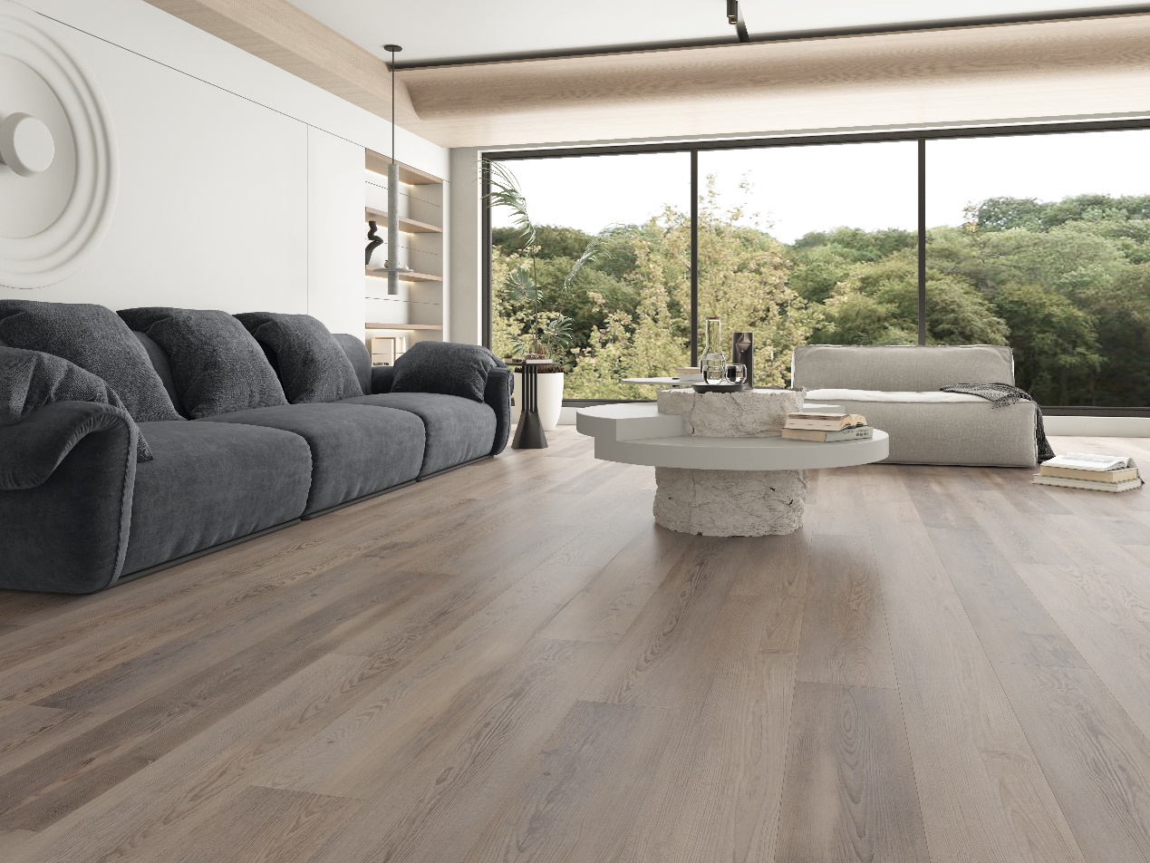 Vinly flooring product is made primarily from polyvinyl chloride (PVC), calcium carbonate (limestone), plasticizers, additives (such as pigments, stabilizers, lubricants, foaming agent, etc.). It is composed of one clear PVC embossed wear layer with a final UV coating, printing film layer for décor, substrate layer for structural strength and stability, and may include a backing (such as IXPE or Cork) to improve acoustic performance and increase comfort underfoot. The product is waterproof, easy to install and maintain.