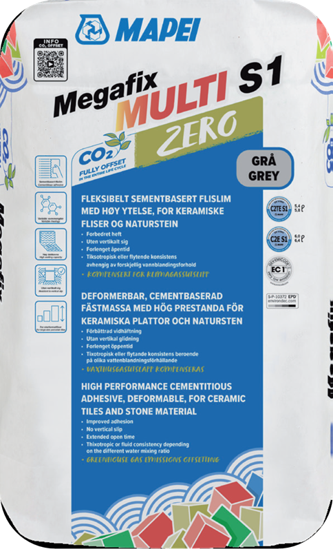 Megafix Multi S1 Zero is a high-performance, deformable grey cementitious adhesive with variable rheology, with no vertical slip or with high wetting capacity, extended open time, with very low emission of volatile organic compounds, for ceramic tiles and stone material including in large format. The product is C2TES1 class if mixed with approximately 5,4-5,8 litres of water, or C2ES1 class if mixed with approximately 6,0-6,4 litres of water.