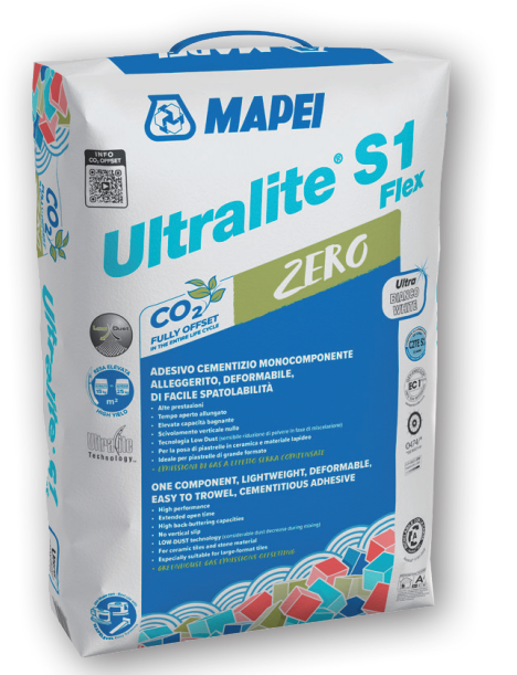 Ultralite S1 Flex Zero white is a one-component, high-performance, deformable, lightweight, white cementitious adhesive with no vertical slip and extended open time, Low Dust technology and extremely high yield. Easy to apply by trowel with high back-buttering capacities for ceramic and stone tiles. Ideal for large-format tiles.