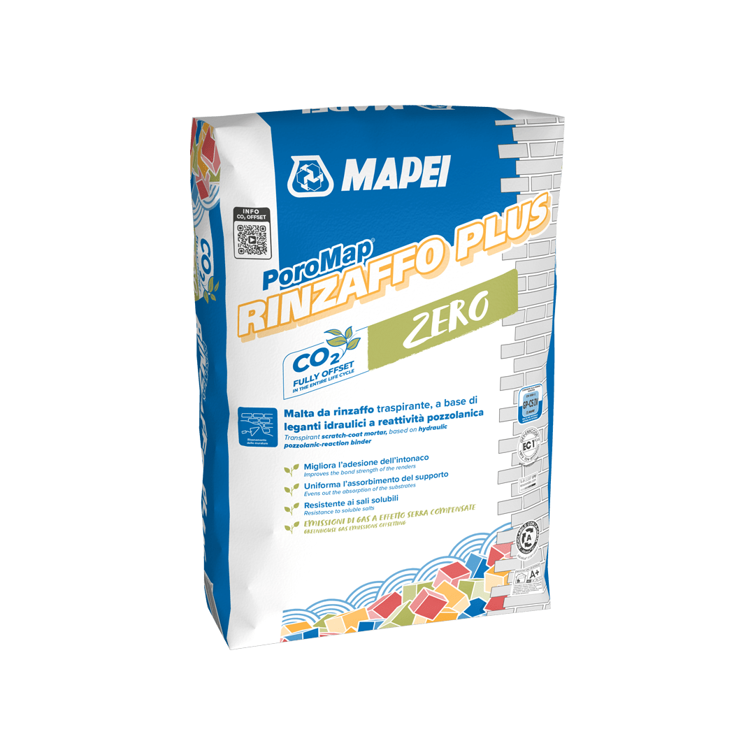 Poromap Rinzaffo Plus is a salt-resistant, breathable scratch-coat mortar, based on hydraulic, pozzolanic binders, to be used as first layer to improve the bond of the render and even out the absorption of the substrate.