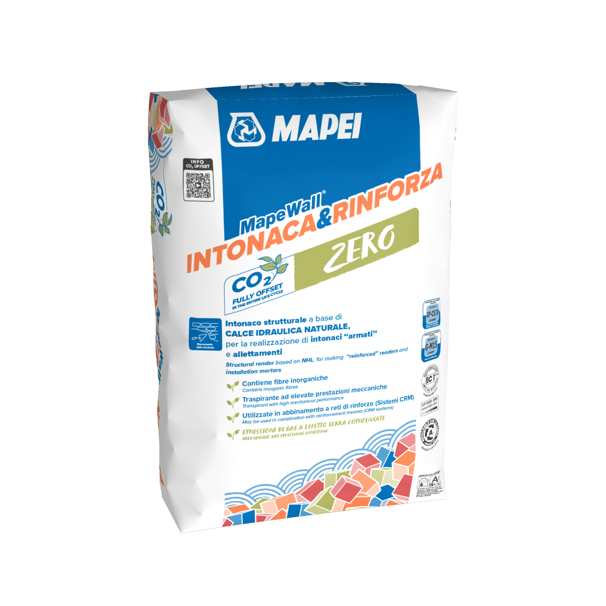 Mapewall Intonaca & Rinforza is a high-strength fibre-reinforced natural hydraulic lime-based breathable rendering and masonry mortar with very low emission level of VOC for making structural render, even “reinforced” (CRM) and installation mortar