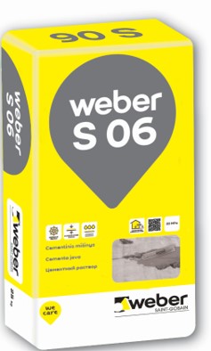 weber S 06 is a frost resistant, cement mortar for simple filling and levelling applications. Recommended layer thickness 2-10 mm. Inexpensive mortar for simple repairs, suitable for both indoor and outdoor use, resistant to freeze.