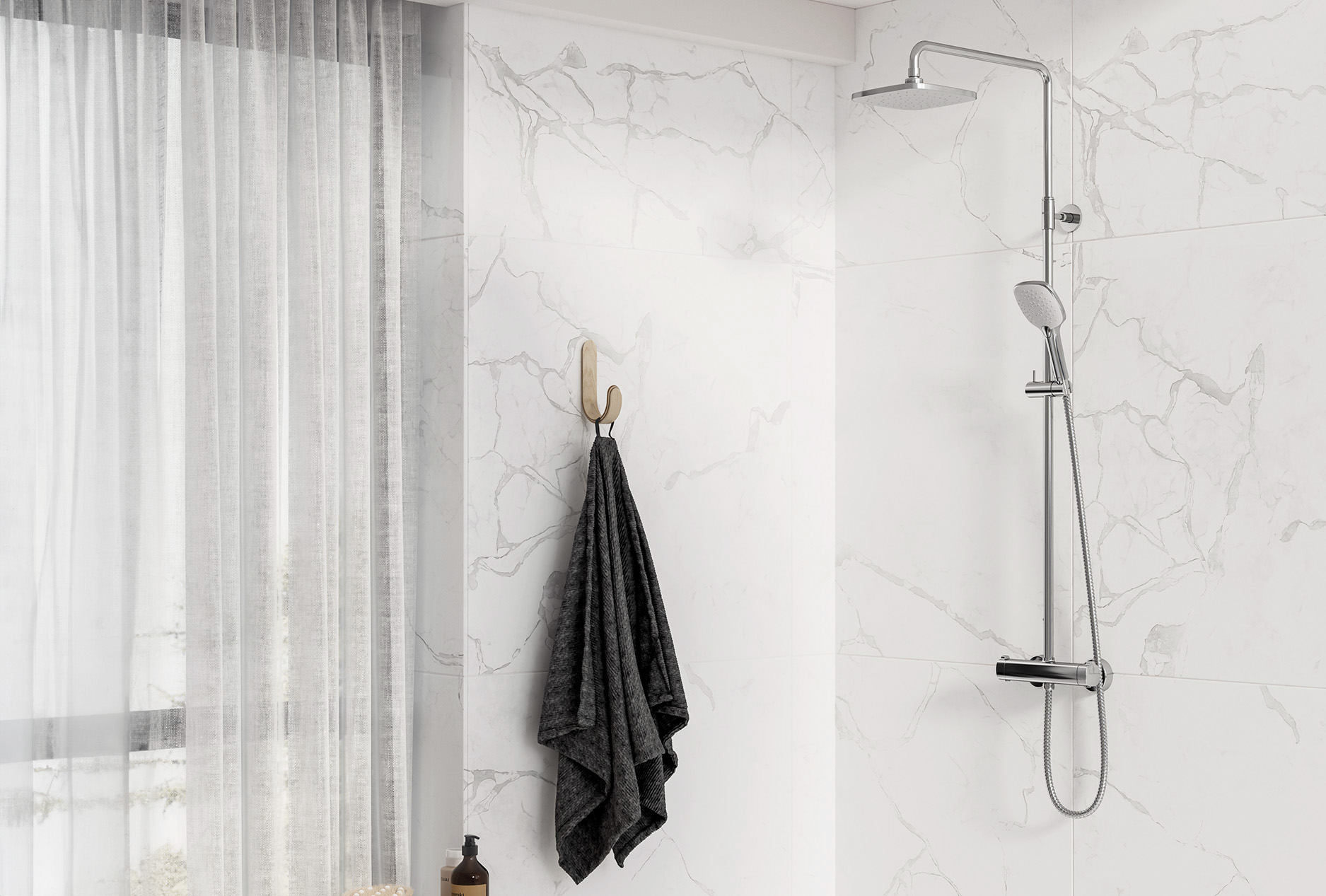 Damixa Shower Systems are meant for installation in bathrooms. The product consists of a thermostatic shower mixer, head- and hand shower, shower hose with anti-twist, and adjustable shower rails for improved installation.